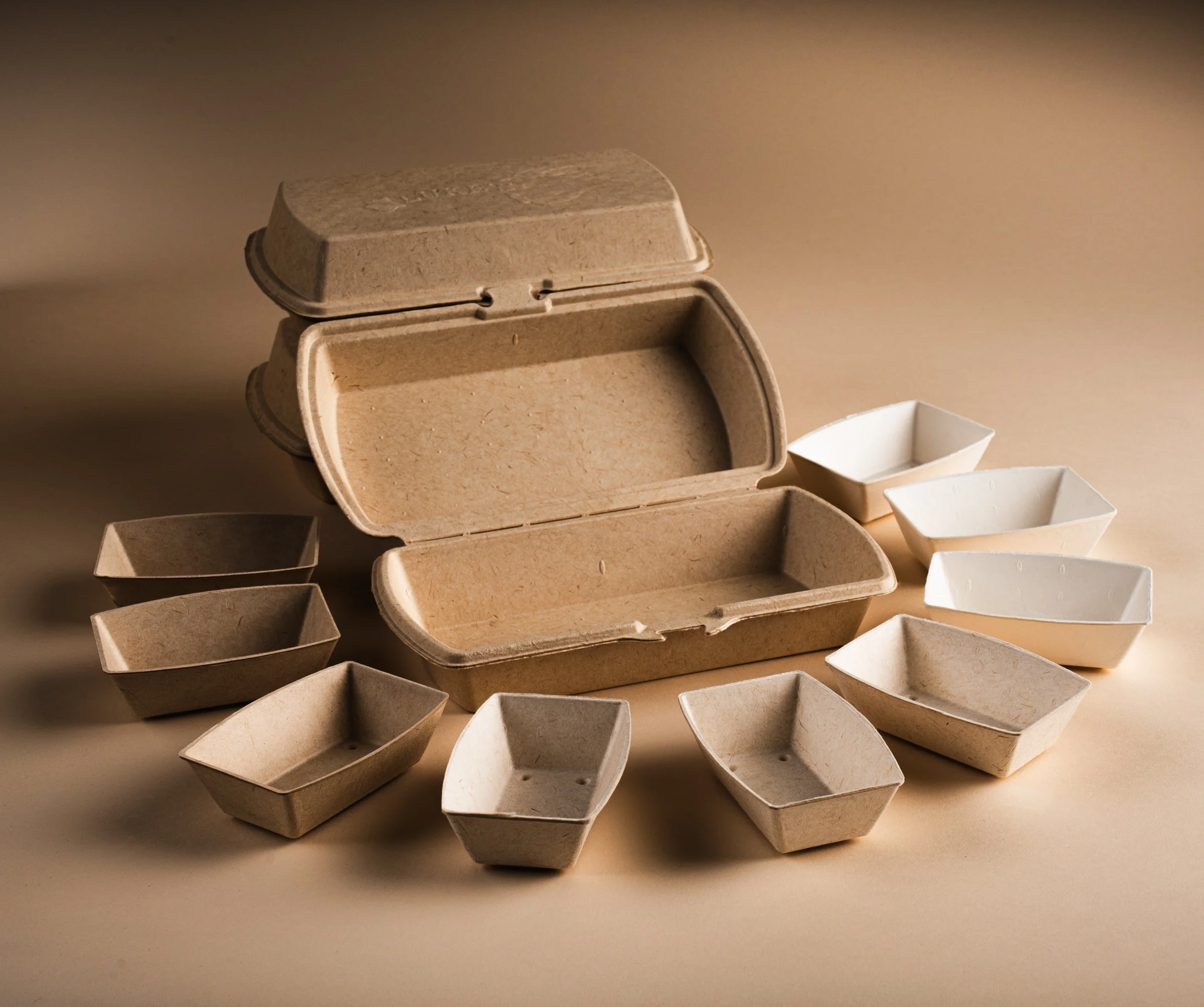 The formed product goes through a series of heated, high-pressure molds, delivering a product that closely resembles the appearance and functionality of thermoformed plastic.